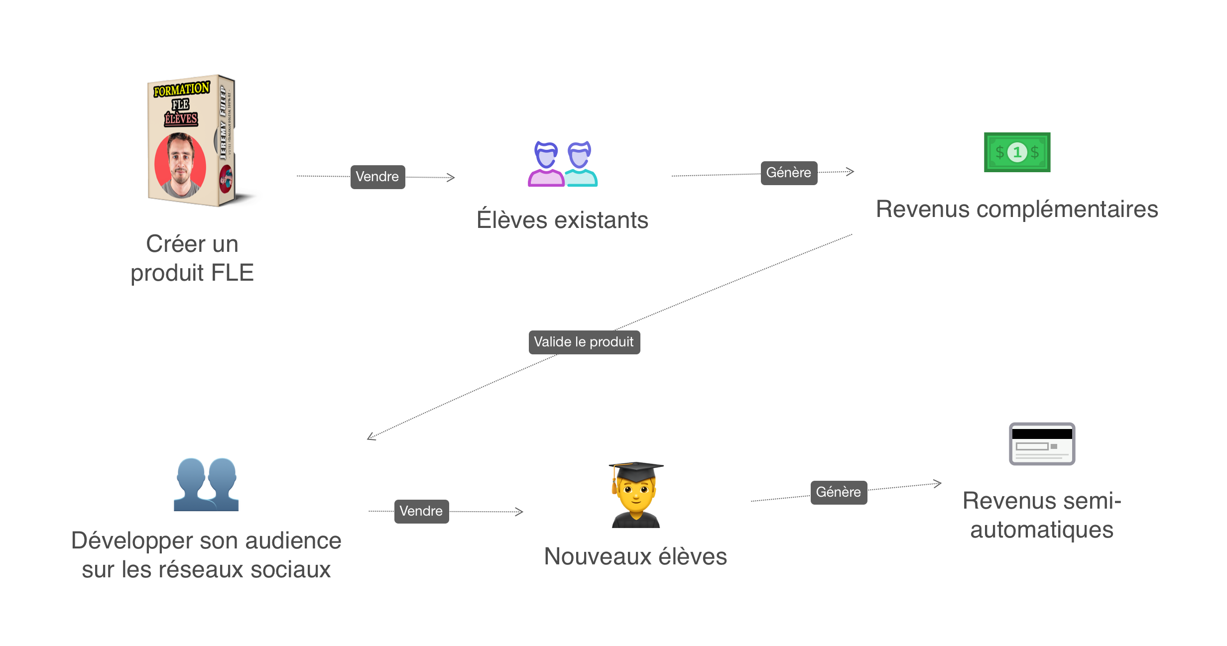 Les produits FLE te permettent tout simplement de gagner plus d'argent, car ce sont des produits scalables : ils peuvent être venus à beaucoup d'élèves en même temps sans nécessiter davantage de temps ou de travail de ta part.