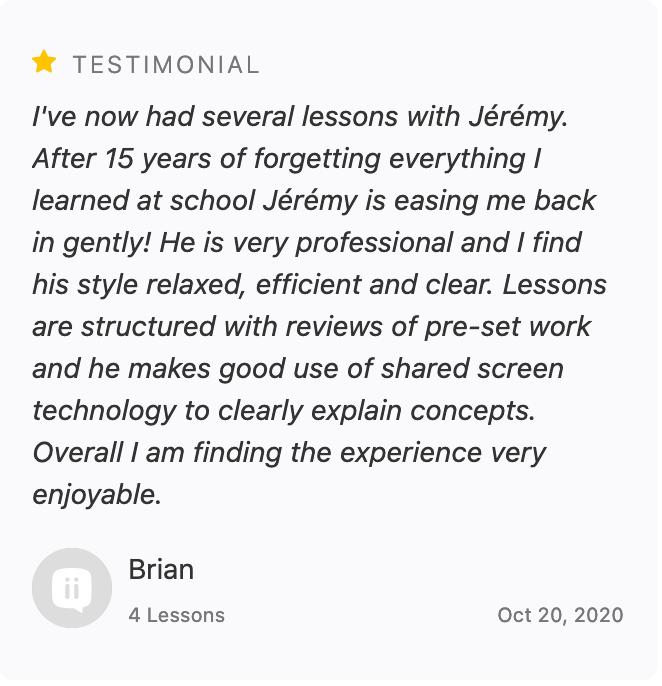 Après des années d'enseignement en présentiel dans plus de 4 pays (France, Allemagne, Angleterre, Chine), j'ai décidé de me concentrer à 100% dans l'enseignement de cette discipline sur internet.