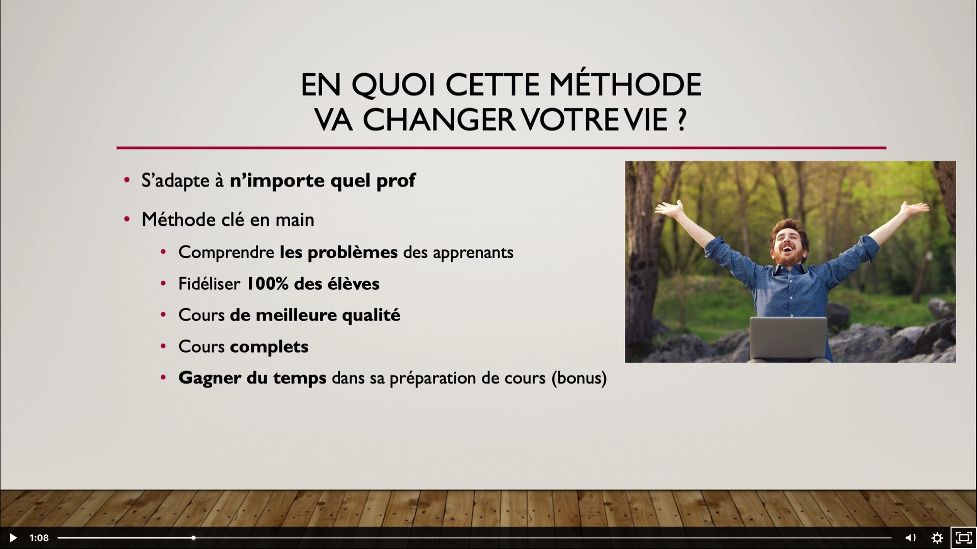Je vous fais gagner un temps colossal (des mois, voire des années?) en fonction de votre aisance préalable à enseigner. Vous n'aurez qu'à appliquer mes conseils basés sur des années d'expertise en tant qu'enseignant de français pour avoir des résultats immédiats dès votre premier cours.